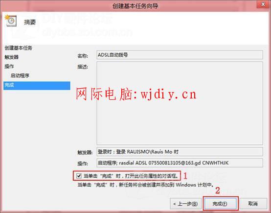 第8步、在完成設置界面,勾選如下圖標注“1”處的“當單擊“完成”時,打開此任務屬性的對話框。”,然后點擊標注“2”處的“完成(F)”按鈕。如下圖所示: