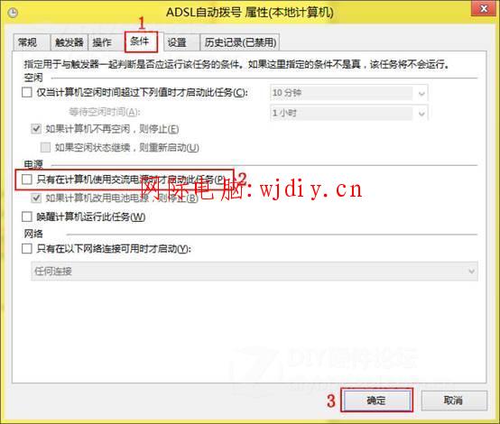 第9步、在彈出的屬性設置窗口,點擊“條件”選項卡,取消勾選“只有在計算機使用交流電源時才啟動此任務(P)”,最后點擊“確定”按鈕結束設置。如下圖所示: