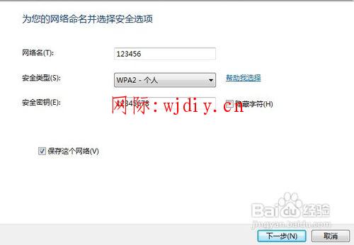 填好網絡名(用作無線網絡的SSID),然后是填寫安全密鑰(用作無線的連接密碼),把“保存這個網絡”勾上,然后點擊下一步。