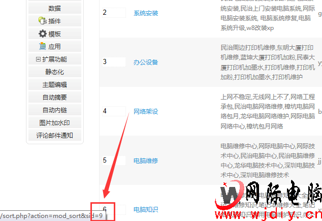 第二種:若分類啟用了別名,咱就進EMLOG后臺,點左側“分類”進管理頁面,已建立好的分類是否已列在眼前?移動鼠標到藍色字鏈接上面,再注意看瀏覽器狀態欄,一串網址中sid=后面的數字就是分類ID咯;狀態欄是嘛玩意兒?就是鼠標移到網頁鏈接上面,瀏覽器下方會顯示網址的那東東,Chrome與IE會略有差別也差不多的
