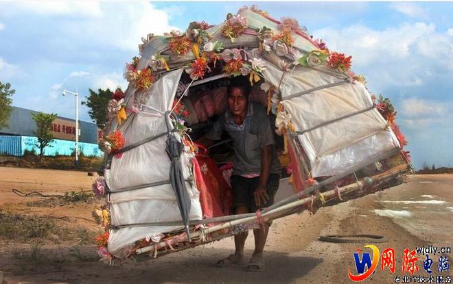 每隔一年或半年,蝸?;丶?廣西柳州市融安縣潭頭鄉(xiāng)39歲的劉齡潮就要從外面扛一間房子回來,網(wǎng)友們也稱他為“蝸牛哥”。11月29日,在廣西梧州市南梧二級公路藤縣路段,記者遇到了劉齡潮和他的房子。相對而言,他今年制作的房子遠比往年的漂亮:半圓形的房子,框架是竹子搭成,外面覆蓋著幾層雨布和床單,還綁滿了五彩繽紛的彩帶和塑料花,牢固而漂亮。