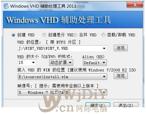 1.運行下載到的“VHD_OneKey_2011_51.exe”,切換到“創建VHD”,然后進行下述的設置(下圖3):