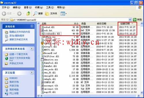 四、找到該文件所在目錄C:\WINDOWS\system32,并利用“創(chuàng)建日期”排列該目錄下所有文件查看詳細(xì),這時(shí)發(fā)現(xiàn)了意外收獲:該目錄下的webad.dll和web.dat兩個(gè)文件與iconhandle.dll的創(chuàng)建時(shí)間相同,再仔細(xì)檢查一下你會(huì)發(fā)現(xiàn)web.dat文件大小為421KB,與U盤(pán)下的兩個(gè)病毒文件夾大小一致!