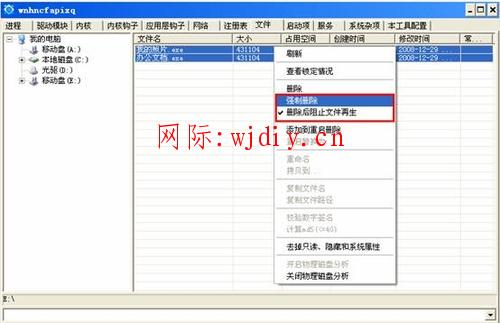 二、利用XueTr工具強(qiáng)制刪除U盤(pán)中的兩個(gè)病毒文件“我的照片.exe”和“辦公文檔.exe”,注意勾選“刪除后阻止文件再生”。