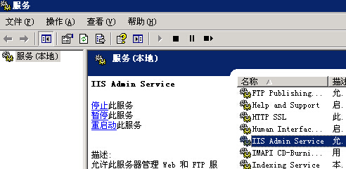 打開“控制面板”->“管理工具”->“服務”。找到“IIS Admin Service” 右鍵點擊“重新啟動” 彈出 “停止其它服務” 窗口,點擊“是”。