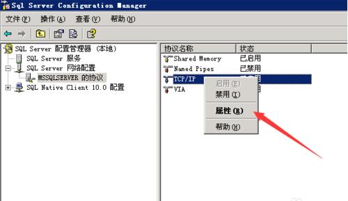 在SQL Server網絡配置中選擇SQLEXPRESS的協議,選擇TCP/IP ,右鍵單擊,選擇屬性