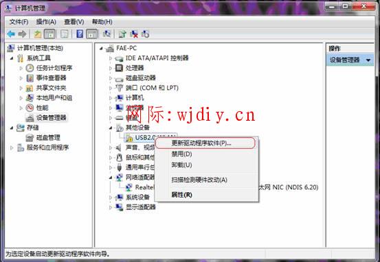 3、在黃色標(biāo)識設(shè)備上點擊右鍵選擇“更新驅(qū)動程序軟件”。
