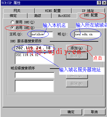 3.DNS:將“啟用DNS”勾選,“主機名”與“域”隨便填寫,在DNS服務器搜索順序里填寫當地DNS地址(如不清楚,請咨詢當地服務提供商),點擊添加。