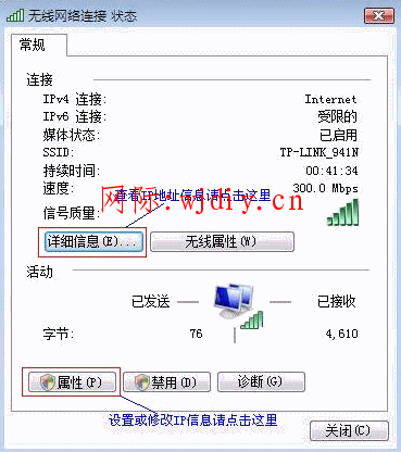 這里可以查看您本機無線網絡連接的IP地址等信息,請檢查IP地址、網關、DNS服務器地址是否配置正確,正確配置