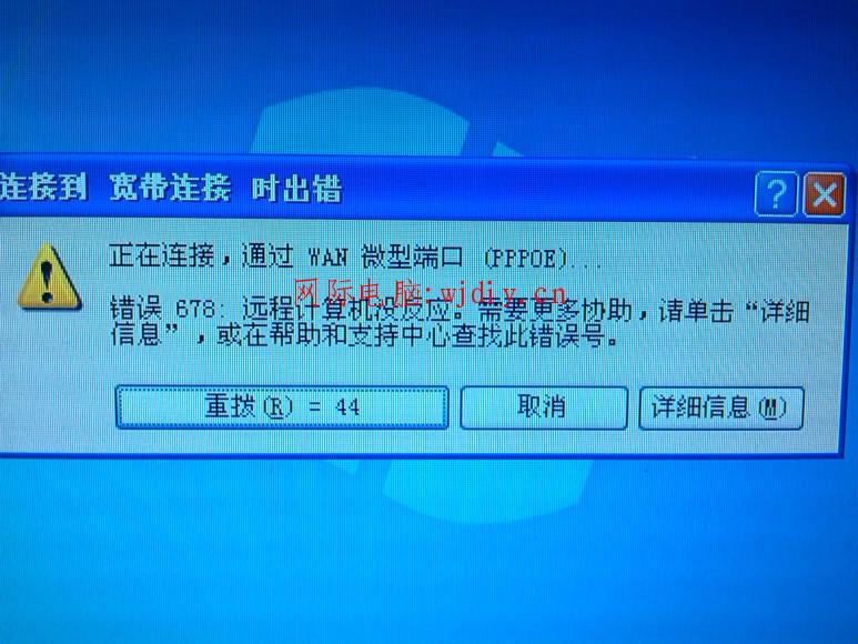 錯(cuò)誤678;遠(yuǎn)程計(jì)算機(jī)沒(méi)有反應(yīng)......是寬帶adsl撥號(hào)上網(wǎng)用戶常常遇到的故障提示,簡(jiǎn)單地說(shuō)就是網(wǎng)絡(luò)不通了。寬帶adsl撥號(hào)上網(wǎng)使用pppoe協(xié)議連接,通過(guò)電話線傳輸數(shù)據(jù),使用adsl專用modem實(shí)現(xiàn)數(shù)據(jù)的調(diào)制解調(diào),錯(cuò)誤提示678的含義是,遠(yuǎn)程計(jì)算機(jī)無(wú)響應(yīng),意思是從計(jì)算機(jī)發(fā)出指令到網(wǎng)卡向外發(fā)送數(shù)據(jù),包括電話線的傳輸,局端(電信局機(jī)房端)端子板的端口處理到返回?cái)?shù)據(jù)到計(jì)算機(jī)的過(guò)程中數(shù)據(jù)傳輸出問(wèn)題都會(huì)提示。