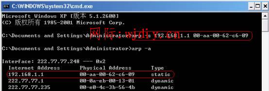-s 為主機創建一個靜態的ARP對應條目,如::arp -s 目的主機IP地址 目的主機MAC地址。如圖,從圖中可以看出靜態綁定了192.168.1.1以后,在arp表中可以看到對應的type(類型)變為static(靜態)了。