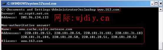 Nslookup命令用于解析域名,一般用來檢測本機的DNS設置是否配置正確。如: nslookup 網站域名,即可解析出網站的IP地址。如圖,可以看出解析www.wjdiy.cn的時候,可以解析出它所有的IP地址: