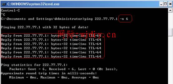例如:ping 222.77.77.1 –n 6表示向222.77.77.1這個地址發送6個數據包;如圖: