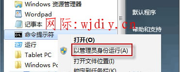 在“開始-所有程序”中找到“附件”。右鍵單擊“命令提示符”,選擇“以管理員身份運行”。