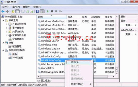 2. 選擇“服務(wù)和應(yīng)用程序”中的“服務(wù)”,在右邊列表中找到“WLAN AutoConfig”,右鍵選擇“啟動(dòng)”。