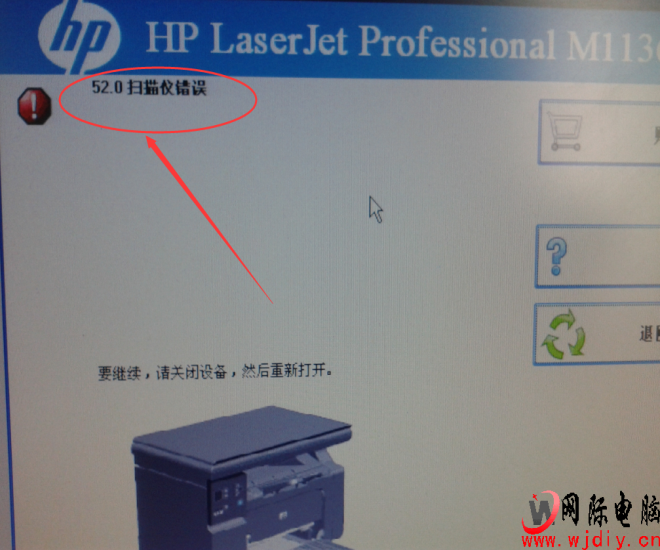 52.0掃描儀錯(cuò)誤,上午去民治沙元埔大廈修打印機(jī);打電話是說打印機(jī)不能打印了;不知道怎么回事!他們公司是開網(wǎng)商城的今天是雙11急了!看了一下是:HP1136打印提示錯(cuò)誤52.0掃描儀錯(cuò)誤怎么消除呢?報(bào)錯(cuò)如下圖: