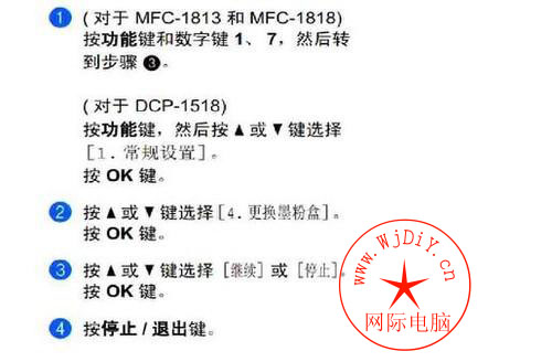 兄弟MFC-1813的一體機加粉后如何清零讓打印重新識別硒鼓;兄弟mfc-1813打印機加粉后清零方法 顯示更換墨粉怎么處理?如下圖