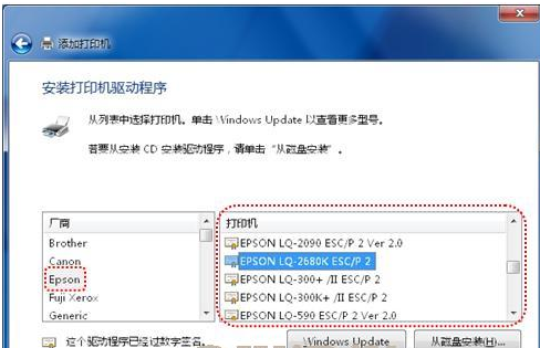 第四步、在“廠商”中選擇“Epson”,在“打印機”中選擇所使用的打印機型號,并按照屏幕提示完成驅(qū)動程序安裝。