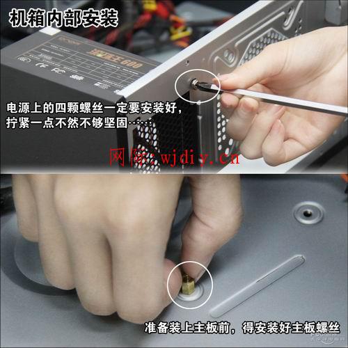 安裝好主板上得CPU、散熱器和內存后,接下來需要把電源、主板和硬盤安裝在機箱上。