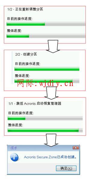 第六步:系統顯示正在重新調整分區提示,調整完畢后,接著顯示正在創建分區提示,接下來是“激活Acronis啟動恢復管理器”提示,最后顯示ASZ創建成功信息。