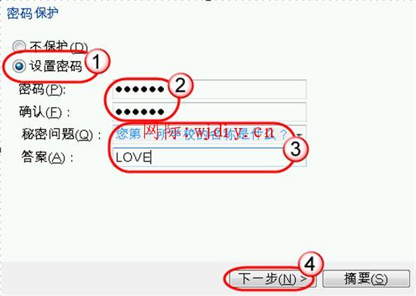 第四步:接下來彈出密碼保護對話框,用來設置對備份安全區的操作保護。為了防止別人隨意進入這個安全分區,最好設置保護密碼,選擇“設置密碼”。兩次輸入相同的密碼,并在下面選擇秘密問題后輸入其答案。設置完畢,點擊“下一步”。