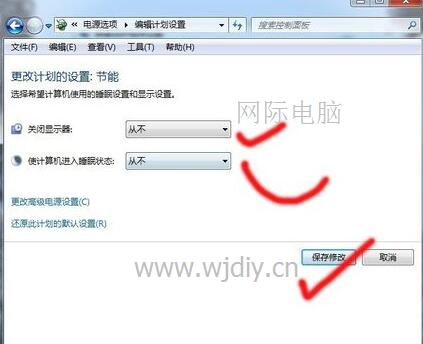 5.分別將關閉顯示器的時間設為從不,計算機進入休眠狀態的時間也設為從不