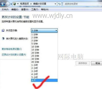 在控制面板-電源選項里邊,把電腦選擇成平衡模式,或者在節能模式下, 編輯計劃設置,把關閉顯示器設置為從不