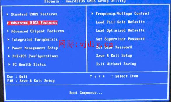上圖1:開機按Del鍵進入該BIOS設置界面,選擇高級BIOS設置Advanced BIOS Features