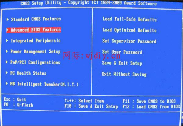 上圖1-1:開機按Del鍵進入該BIOS設置界面,選擇高級BIOS設置:Advanced BIOS Features