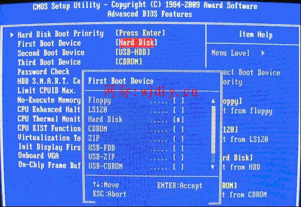 上圖4-1:在第一啟動設備(First Boot Device)這里,有U盤的USB-ZIP、USB-HDD之類的選項,我們既可以選擇“Hard Disk”,也可以選擇“USB-HDD”之類的選項,來啟動電腦。