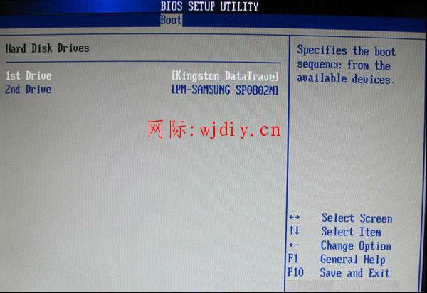 上圖3-2 硬盤驅動器“Hard Disk Drives”選擇:選擇U盤為第一啟動設備“1st Drive”。如果先在“Hard Disk Drives”里面選擇U盤為第一啟動設備,如圖3-2所示,那么這里就會顯示有U盤,那就選擇U盤為第一啟動設備,如圖4-2所示。