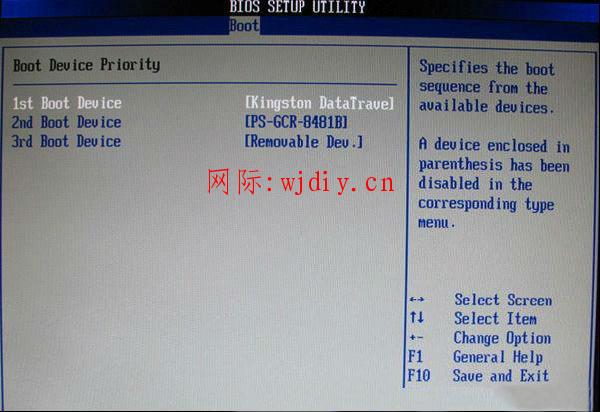 如果在圖1-2的硬盤驅動器“Hard Disk Drives”里面還沒選擇U盤為第一啟動設備,那么這里就不存在和顯示U盤,如上圖2-2所示,但可以選擇移動設備“Removable Dev.”作為第一啟動設備;