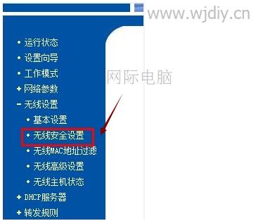 步驟二、輸入賬號密碼之后,進入到了無線路由器的設置窗口,在左邊的菜單欄上選擇【無線設置-無線安全設置】,如圖所示: