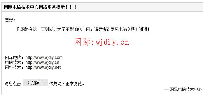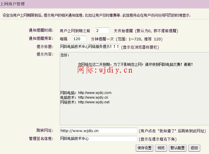 上網(wǎng)用戶管理設(shè)定當(dāng)用戶上網(wǎng)期限到后, 提示用戶的相關(guān)通知信息, 比如讓用戶及時(shí)繳費(fèi)等. 此信息將會(huì)在用戶訪問任何網(wǎng)頁的時(shí)候顯示.再點(diǎn) 預(yù)覽 如下圖: