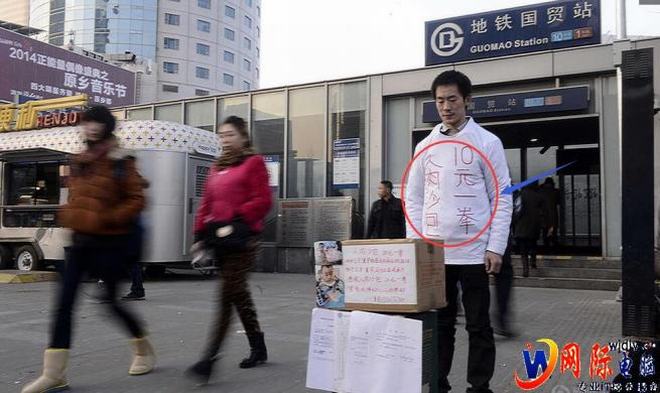 2014年11月28日,北京地鐵國貿站E口,一名三十歲左右男子身穿白T恤,上面寫著“人肉沙包,10元一拳”。他面前還有一個募捐箱,貼出了多家醫院的診斷證明。箱上的文字稱,他叫夏軍,愿做“人肉