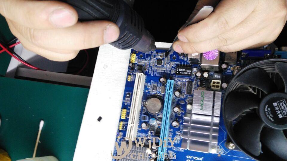 電腦usb接口不能用 有一塊主板上的USB接口接入設(shè)備卻無法識(shí)別,于是就換一塊USB芯片看看 電腦usb接口不能用 首先用加熱器把芯片腳融掉取下后,再進(jìn)行