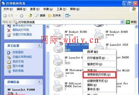 在“打印機和傳真”窗口中,右鍵點擊您使用的打印機圖標,選擇“使用聯機打印機”菜單項。如圖 1 使用聯機打印機所示: