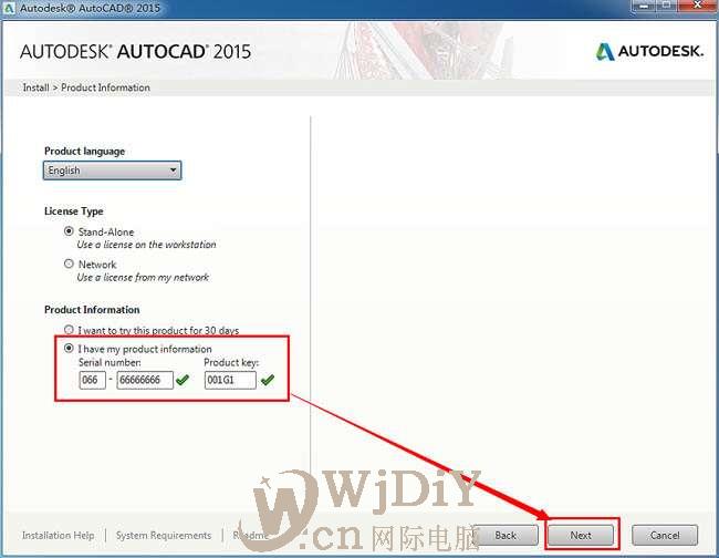 首先選擇語(yǔ)言類型為(English),這里也只有這一個(gè)選項(xiàng),然后選擇許可類型為單機(jī),然后將序列號(hào):066-66666666和產(chǎn)品密鑰001G1寫入產(chǎn)品信息內(nèi),點(diǎn)擊下一步。 第五步:CAD2015的安裝路徑設(shè)置