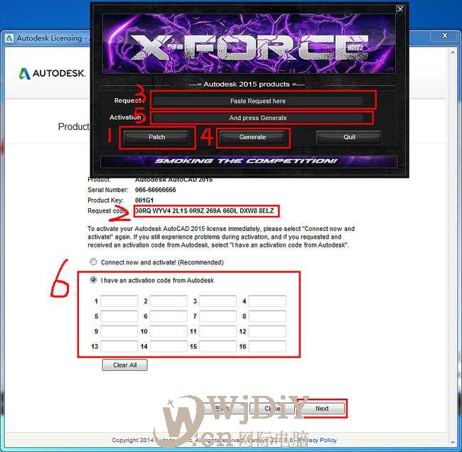 這里請(qǐng)先打開CAD2015 64位英文版安裝包里的注冊(cè)機(jī),如圖所示。按照?qǐng)D示序號(hào)操作,首先點(diǎn)擊1,Patch;然后把2框里面的申請(qǐng)?zhí)枏?fù)制到注冊(cè)機(jī)3框里面;再點(diǎn)擊4,Generate。把5框里面算出的激活碼復(fù)制到6框里面,然后點(diǎn)擊下一步進(jìn)行激活 第十六步:激活完成
