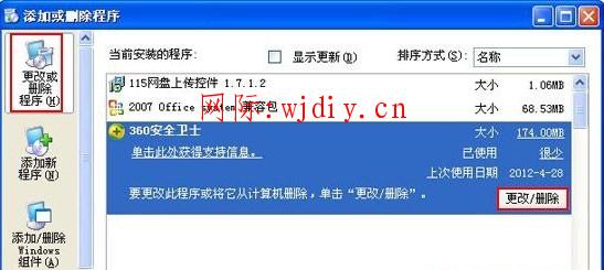 卸載方法二、在開始界面中,我們點擊“控制面板”按鈕,在點擊控制面板之后,將會出現(xiàn)控制面板窗口,然后我們找到“添加或刪除程序”點擊進入,然后我們找到360軟件進行卸載,如圖所示: