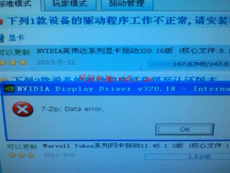 出現7-Zip:Data error是因為驅動文件不完整的問題。建議用驅動精靈軟件,這款軟件會自動檢測NV9500顯卡型號,并且自動安裝上相匹配的最新版驅動