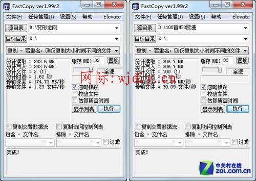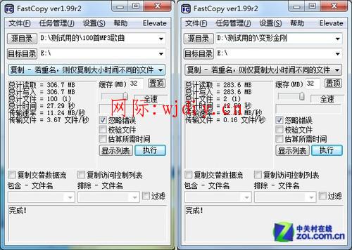 FastCopy是個小巧的文件/目錄拷貝工具,其功能強大,性能優越,能充分挖掘文件系統和硬盤驅動器的能力,并且支持計數和計時。這里使用一個包含1個視頻文件總計容量為283MB的《變形金剛》MP4視頻剪輯文件,可以反映出優盤在應對大容量單個文件的實際拷貝能力;另一個文件包含100首MP3歌曲,總計容量為306MB,用來反映優盤應對零散文件拷貝能力。