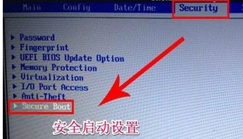 第2步、選擇Security選項卡,選擇Secure Boot,按回車鍵——選擇Disabled,按回車鍵;