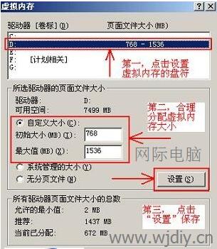 虛擬內存的設定主要根據你的物理內存大小和電腦的用途來設定,在桌面上用鼠標右擊“我的電腦”,選擇“屬性”,就可以看到內存了。根據微軟公司的建議,虛擬內存設為物理內存容量的1.5--3倍,例如512MB的內存,虛擬內存設定為768--1536MB;1G的內存,虛擬內存設定為1536--3072MB。也可讓Windows來自動分配管理虛擬內存,它能根據實際內存的使用情況,動態調整虛擬內存的大小。在虛擬內存設置頁面下方有一個推薦數值,如果確實不知道設置多少為最佳,建議虛擬內存就設為推薦的數值。虛擬內存有初始大小與最大值兩個數值,最好把初始大小和最大值設為相同,以避免系統頻繁改變頁面文件的大小,影響電腦運行。內存容量2GB或以上的,如果不運行大型文件或游戲,也可以關閉虛擬內存。