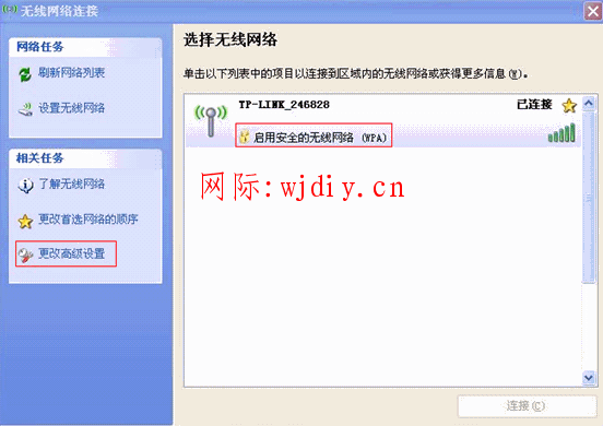 3)點(diǎn)擊更改高級(jí)設(shè)置,進(jìn)入無(wú)線(xiàn)網(wǎng)絡(luò)連接屬性,并在首選網(wǎng)絡(luò)中刪除不相關(guān)的無(wú)線(xiàn)網(wǎng)絡(luò)配置。