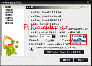 步驟2:在彈出的“選項設置”選中“普通渲染”的下拉菜單,把默認選項“用VMR7渲染”更改為“用VMR9渲染”,“確定”退出。操作如下(圖3)