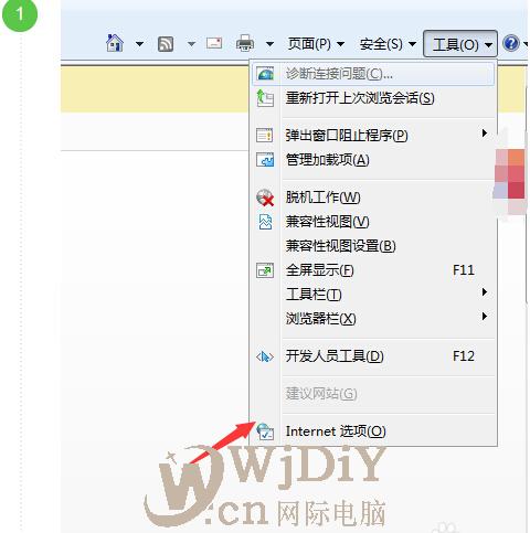 打開IE瀏覽器,點(diǎn)擊右上角的【工具】選項(xiàng),在下拉菜單中找到【Internet選項(xiàng)】點(diǎn)擊打開。